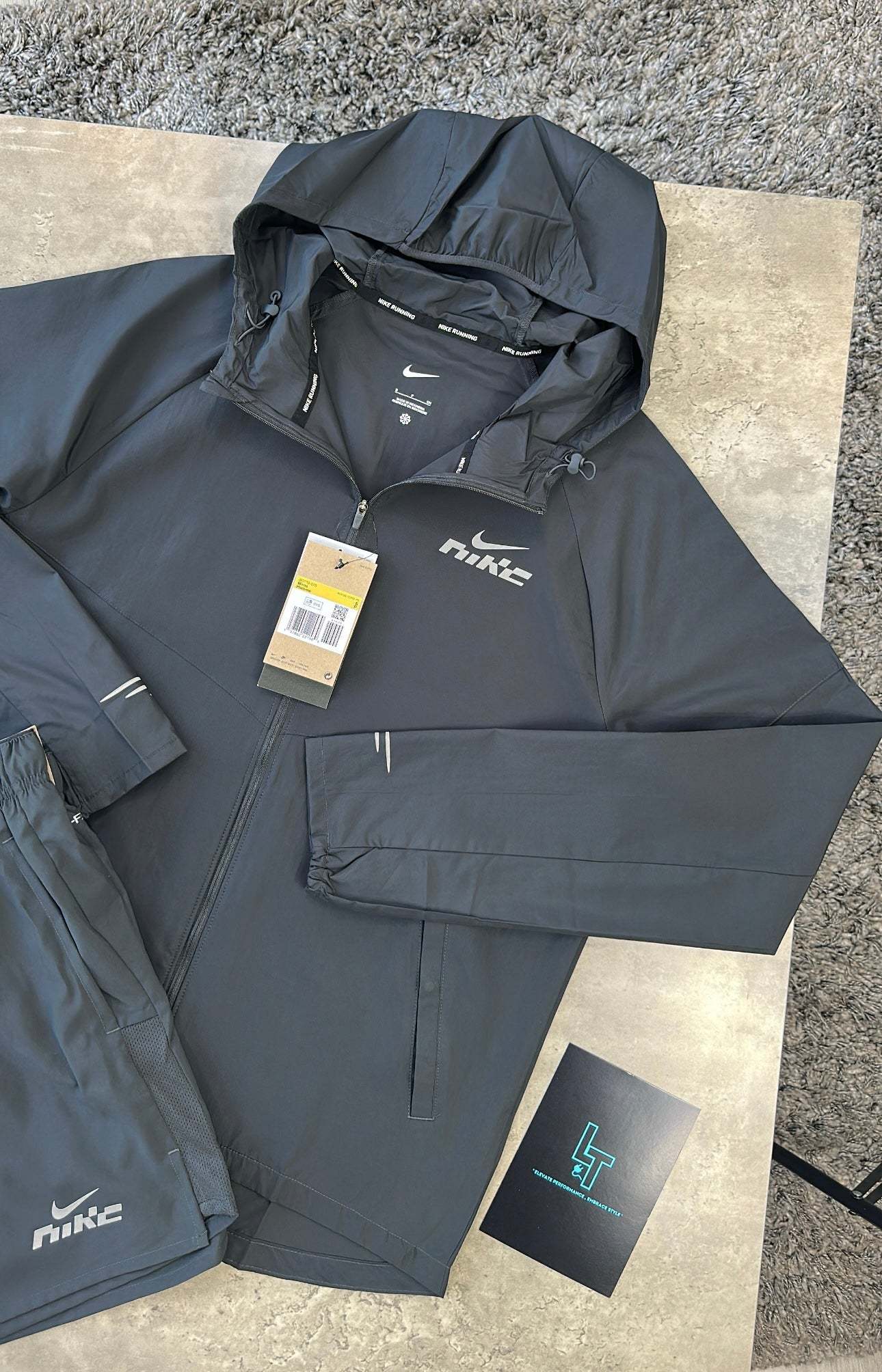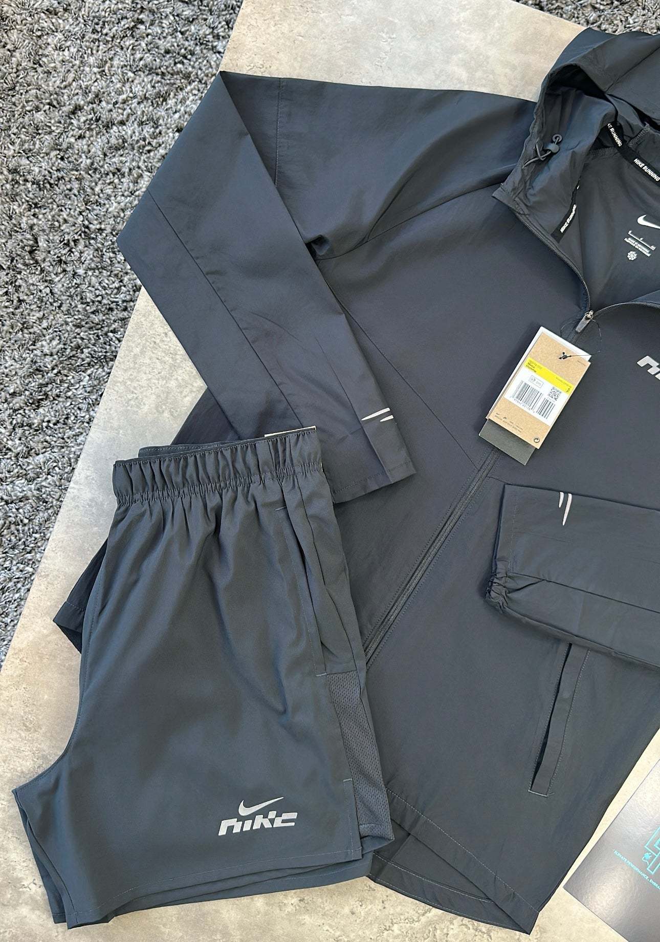 Stay dry and visible in wet weather with the NIKE GRAPHIC REPEL SET. Featuring a water repellent finish, full zip front, popper pockets, and bungee adjustable hood, this set keeps you protected. The 5" Challenger shorts, made from sweat-wicking fabric with a built-in brief, provide extra support for any challenge.