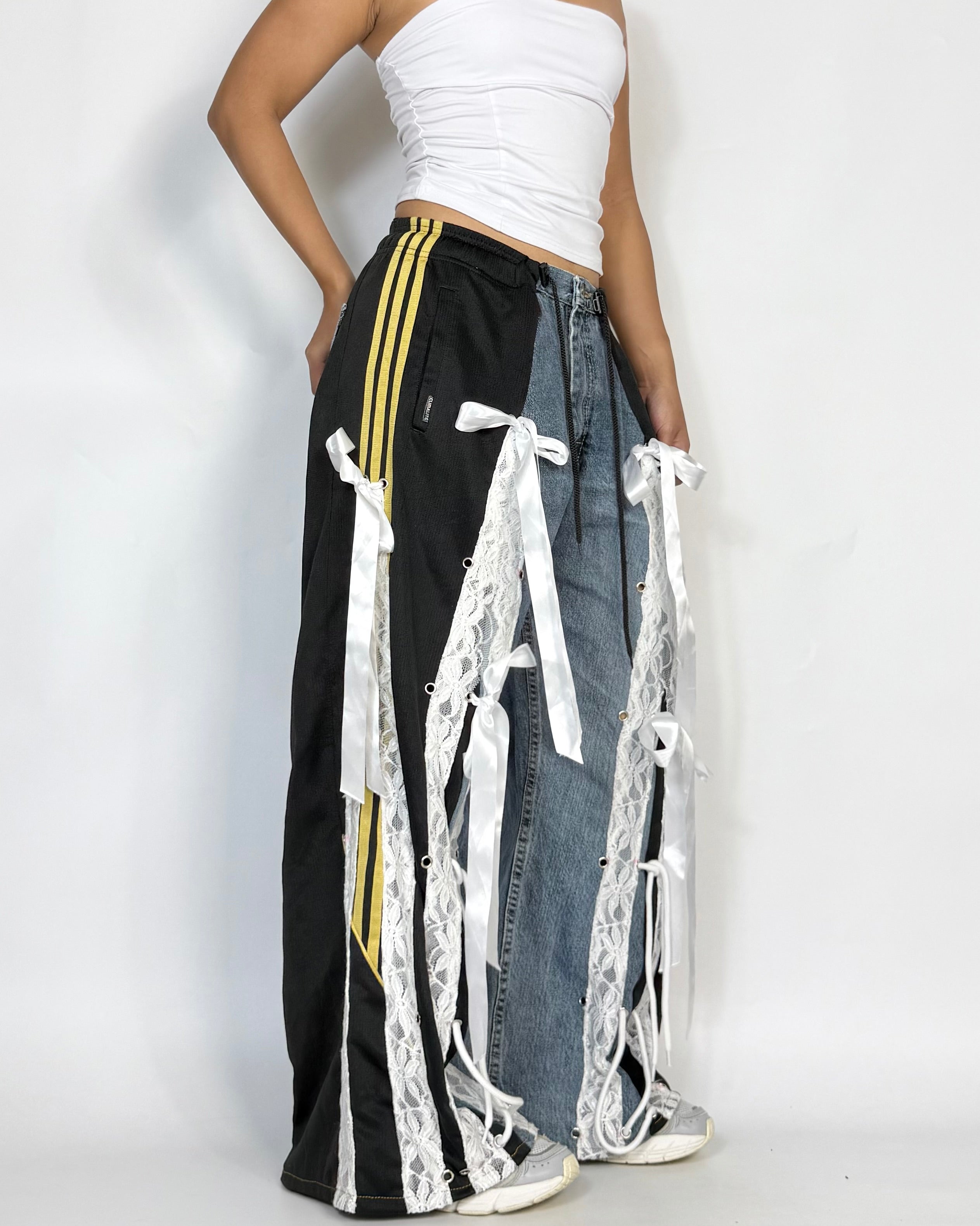 Reworked with lace & ribbon details. Soft meets street. One of a kind & unisex fit!