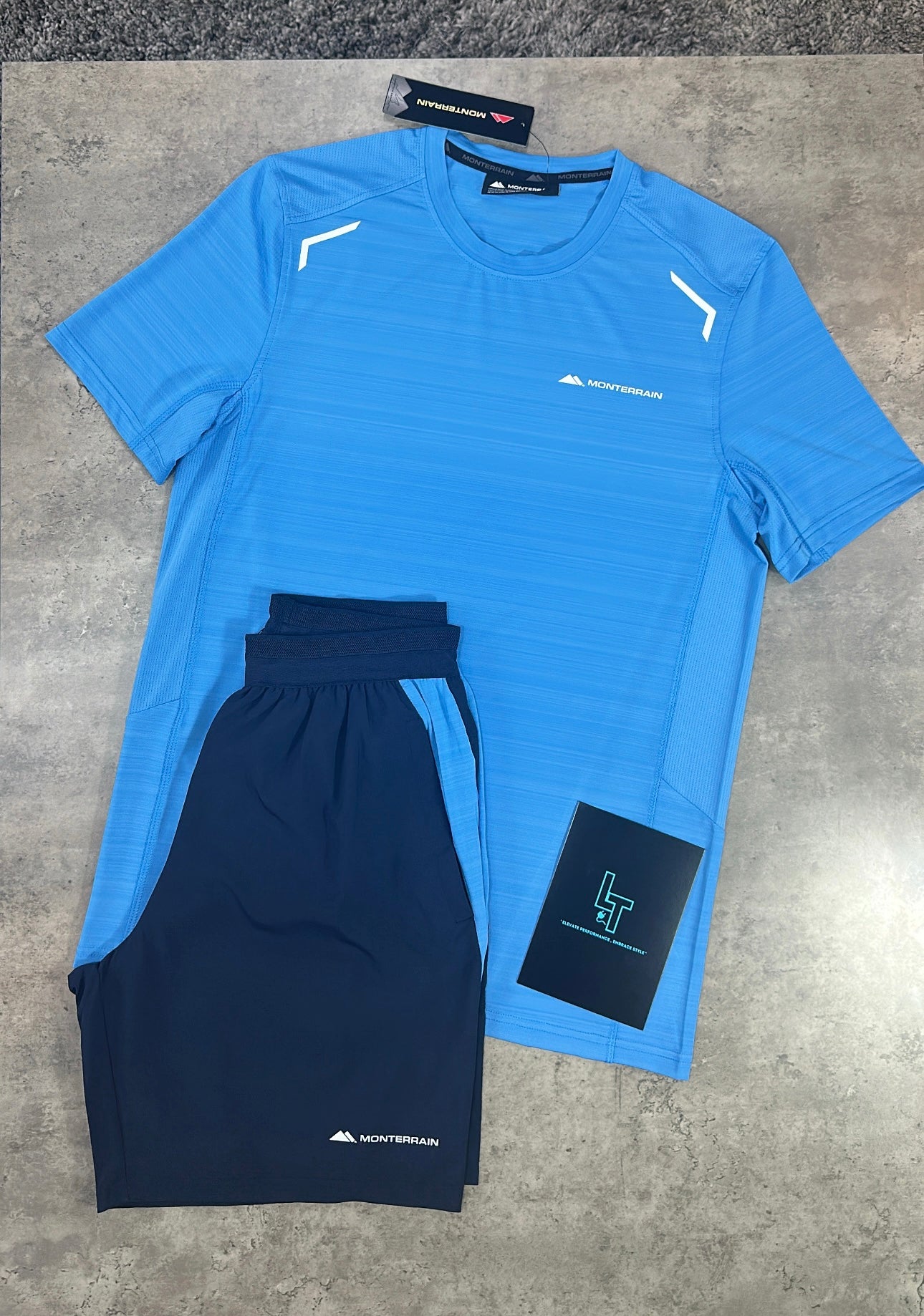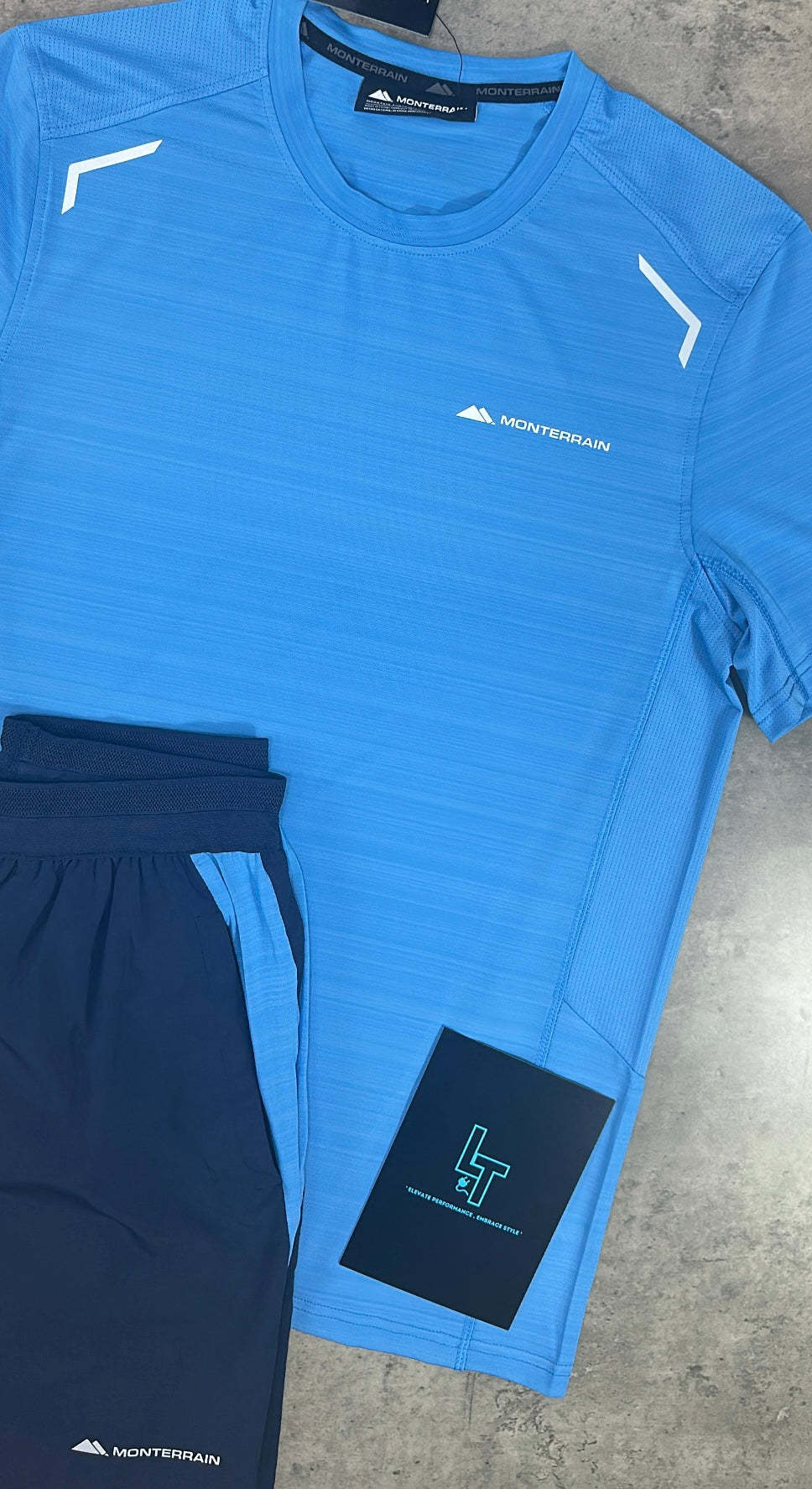 The Monterrain 3.0 Set in sky blue and navy features a short-sleeved tee with a striking all-over space dye pattern that stands out. The elasticated waistband ensures a secure, personalized fit, while open hand pockets offer convenient storage for small essentials. This set combines eye-catching design with practical details, making it a smart choice for those seeking both style and functionality.