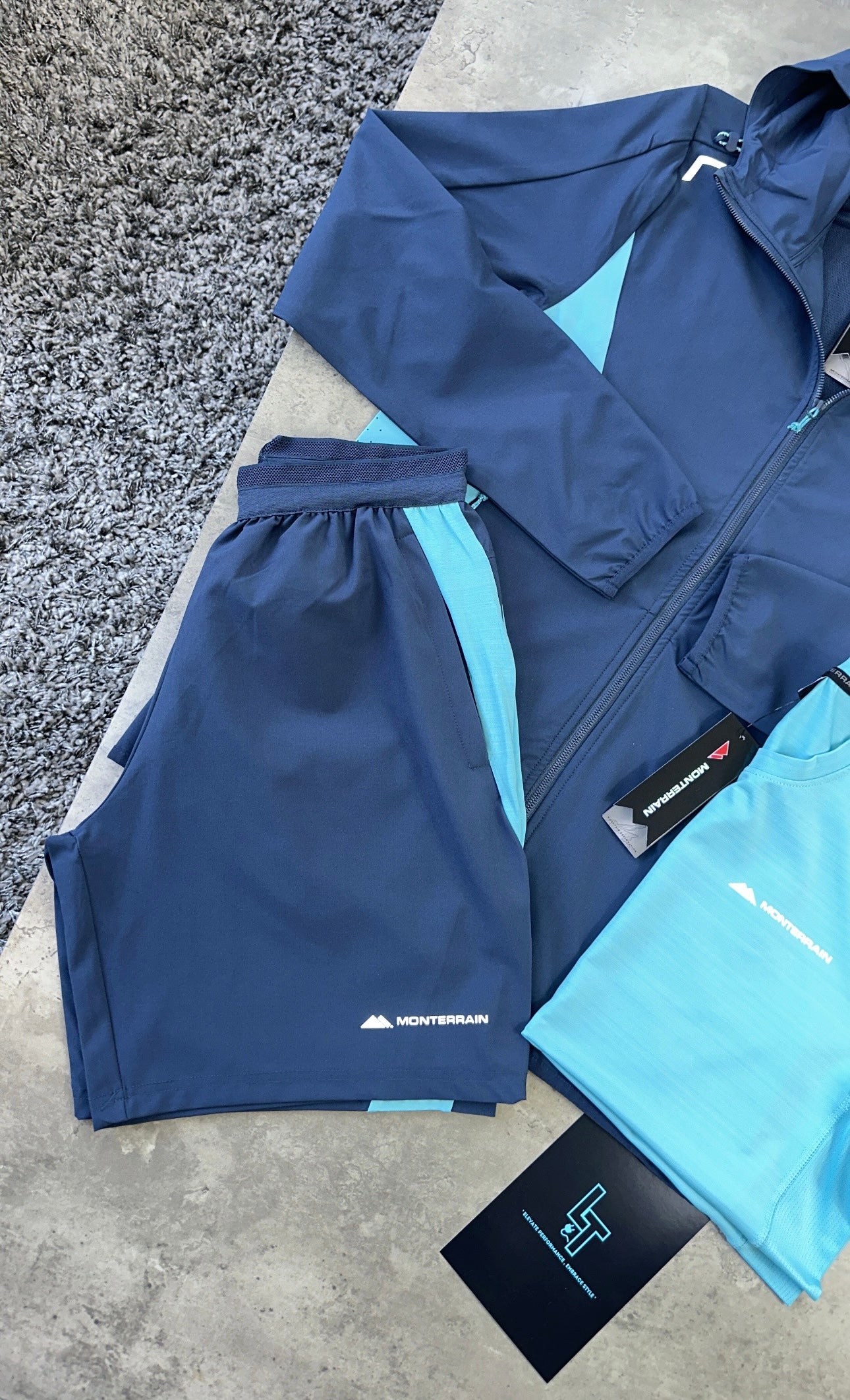 Experience performance and style with this MONTERRAIN 3-piece set. The lightweight wind-resistant jacket features a full-zip closure, adjustable hood, and secure zip pockets. Made from stretchy polyester, the short-sleeved tee boasts a mesmerizing space dye design, ribbed crew neck, and reflective details. The elasticated shorts offers a personalized fit for all your outdoor or daily activities.