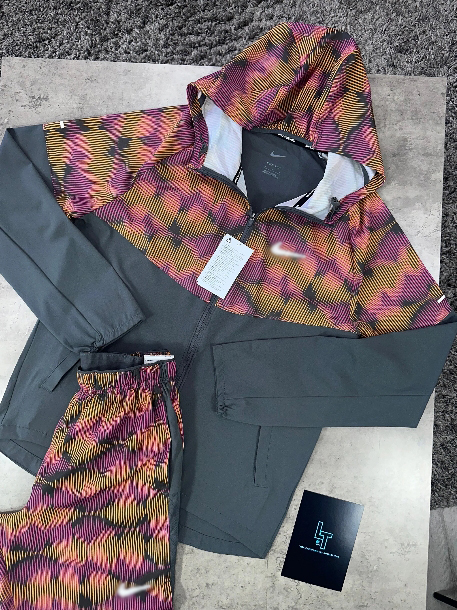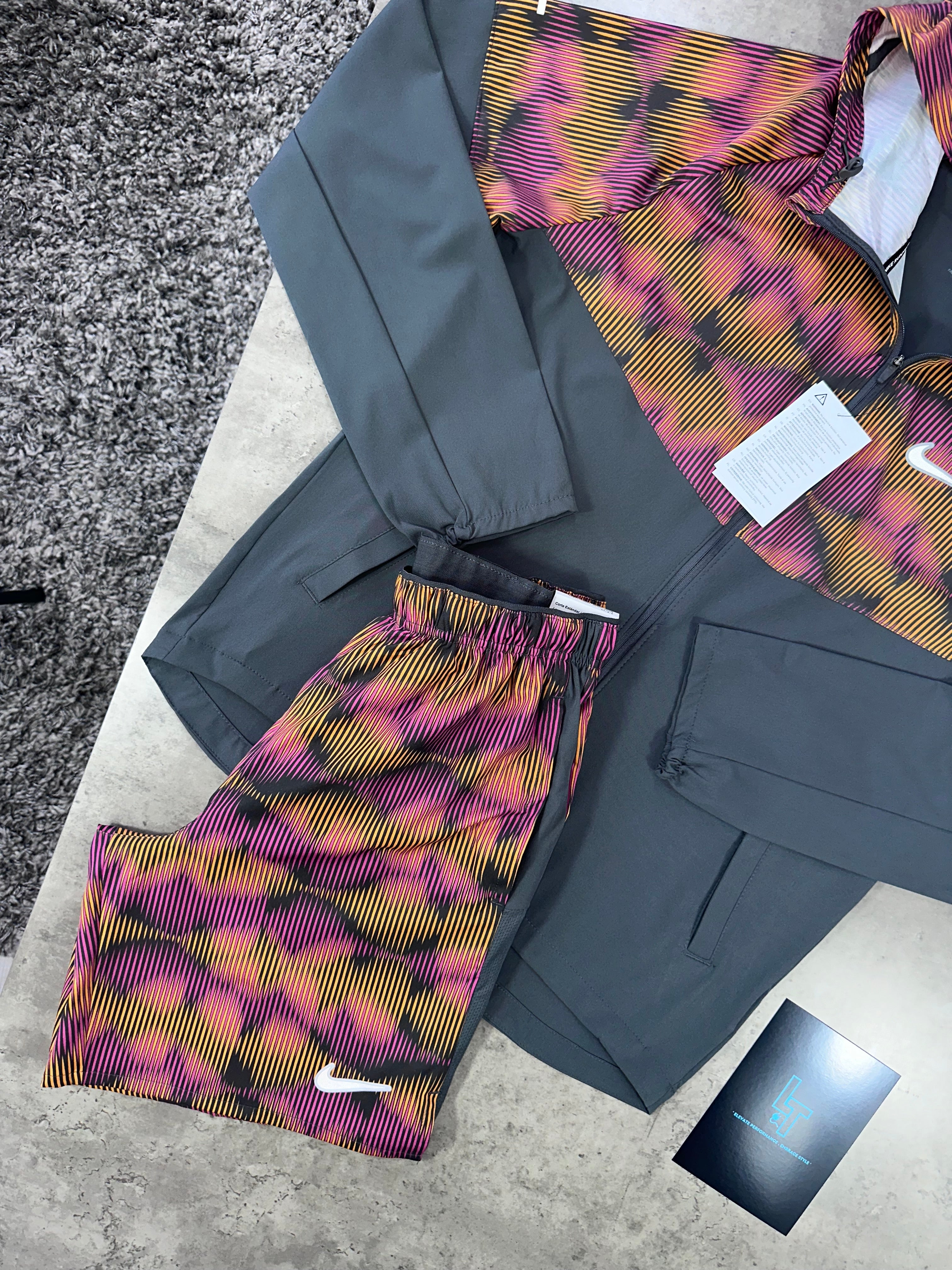 The NIKE Jacket Set in grey and orange features a sweat-wicking Miler Jacket designed to enhance your running performance with lightweight, packable fabric. Complemented by shorts crafted from smooth, breathable woven material, this set offers an elasticated waistband for a customizable fit, brief lining for support, and mesh panels to maintain ventilation and comfort throughout your workout. Ideal for serious runners seeking functional, comfortable gear.