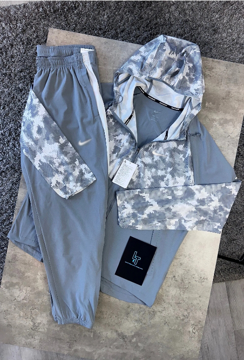 Boost your athletic performance with the NIKE PERFORMANCE TRACKSUIT - GREY CAMO. The jacket, made from durable polyester with water-repellent finish, features a full zipper and bungee-adjustable hood for maximum coverage on rainy days. The pants, also made from lightweight poly fabric, have an elastic waistband and zip fastening for easy wear.
