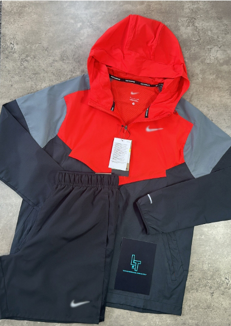 The NIKE WINDRUNNER SET - RED/GREY/BLACK combines a packable, super-lightweight Windrunner jacket with breathable, water-repellent fabric and UV protection, ideal for unpredictable weather and sun exposure. Designed for running, training, and yoga, the sweat-wicking Shorts offer a relaxed fit and breathable comfort. Equipped with a thoughtfully placed pocket, they ensure irritation-free storage as you transition seamlessly from track to gym. This set delivers versatile performance and protection for active lifestyles.