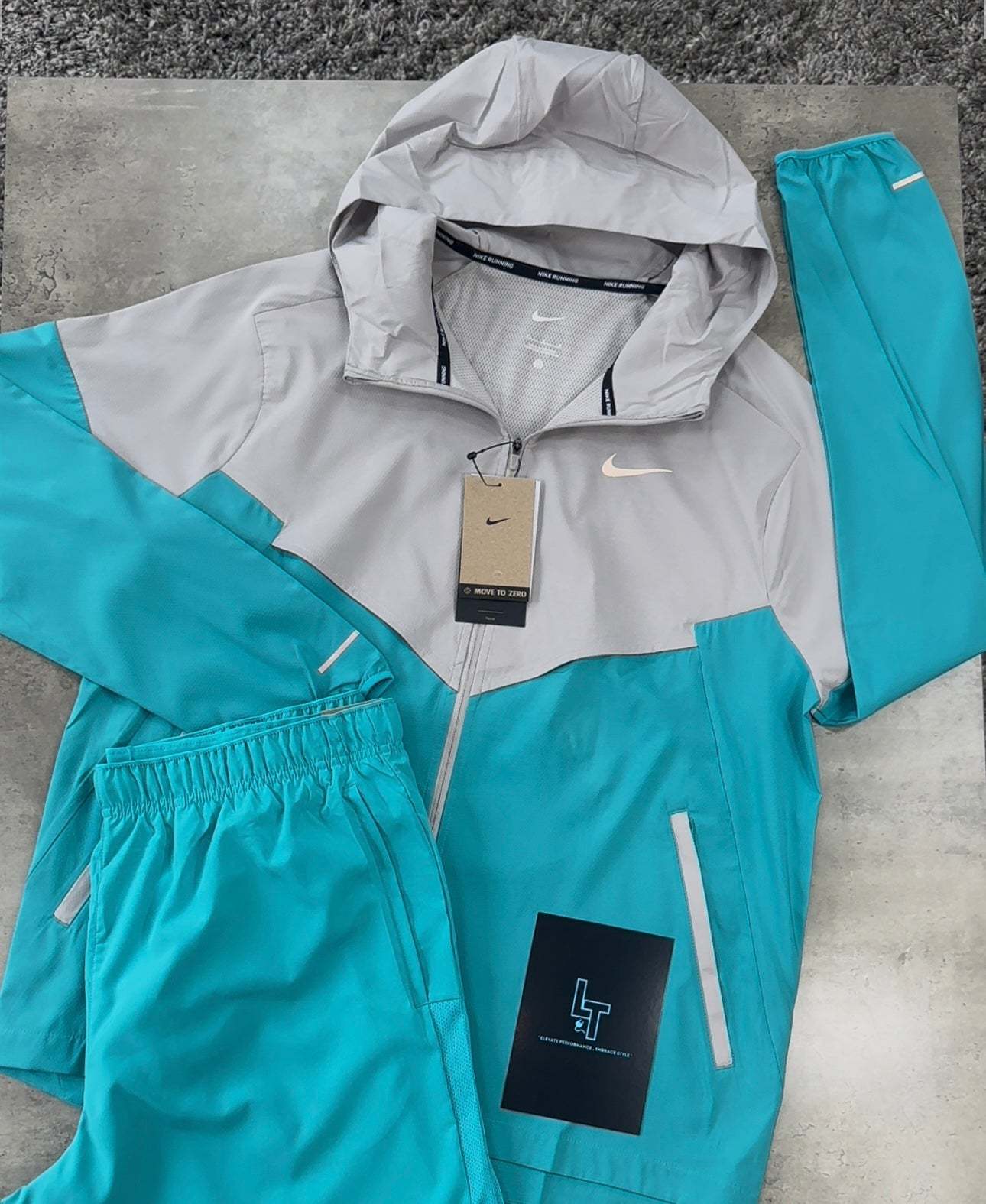 The NIKE WINDRUNNER SET in turquoise and light iron provides multiple features for a comfortable and customizable fit. Keep essentials secure with zip pockets, while a hidden pocket allows for easy packing. Stay cool with the vent at the back and customise your coverage with a full-length zip and bungee cord at the hood. The sweat-wicking fabric, and relaxed fit with mesh panels provide ultimate comfort and ventilation.