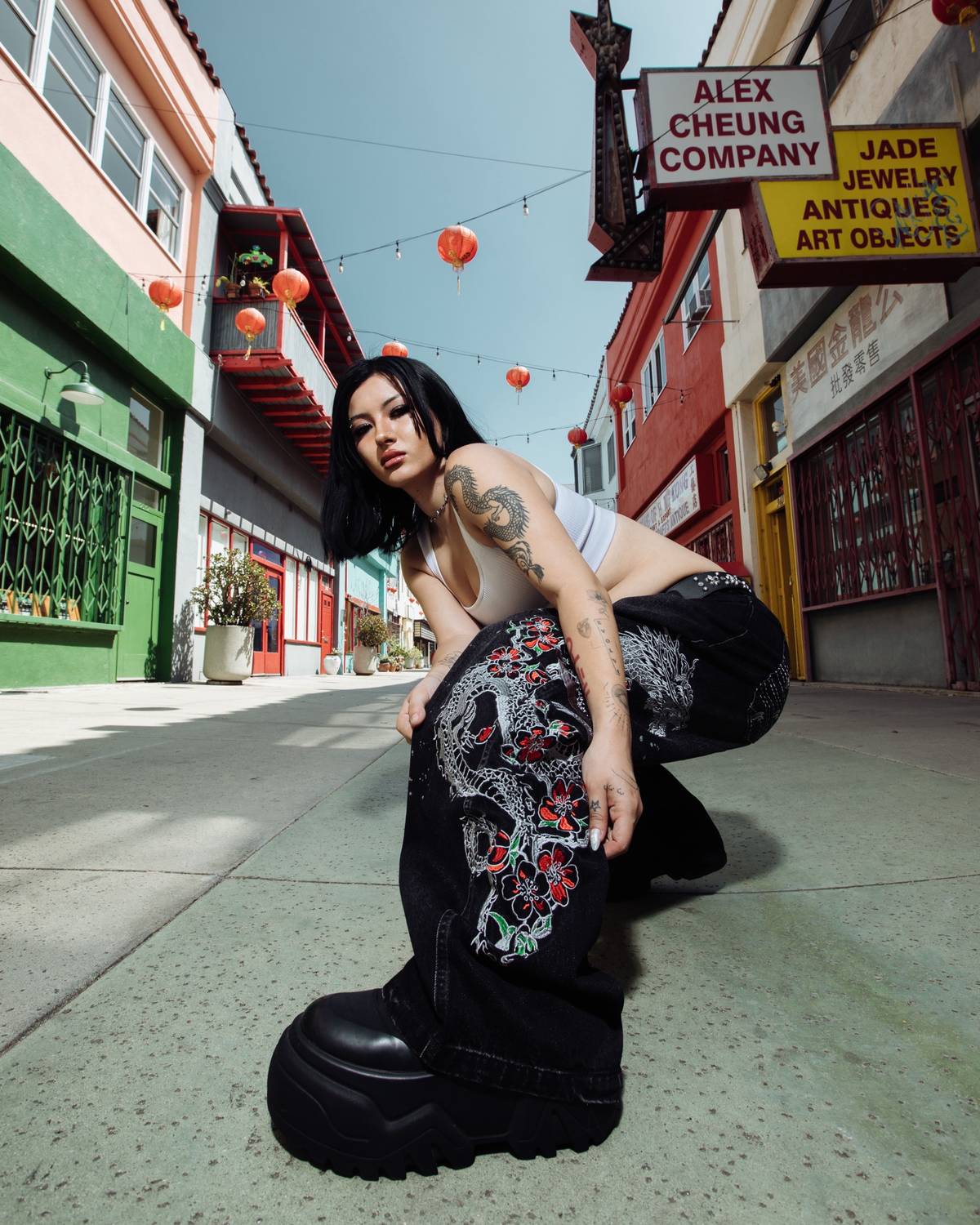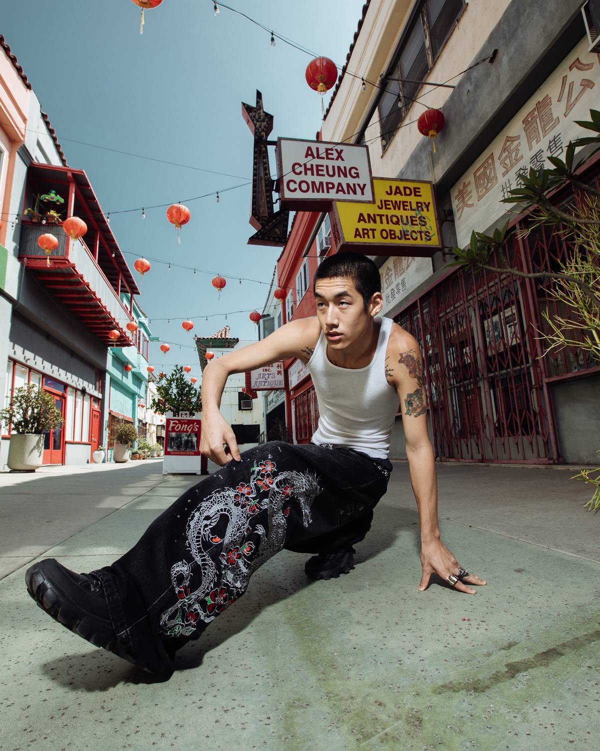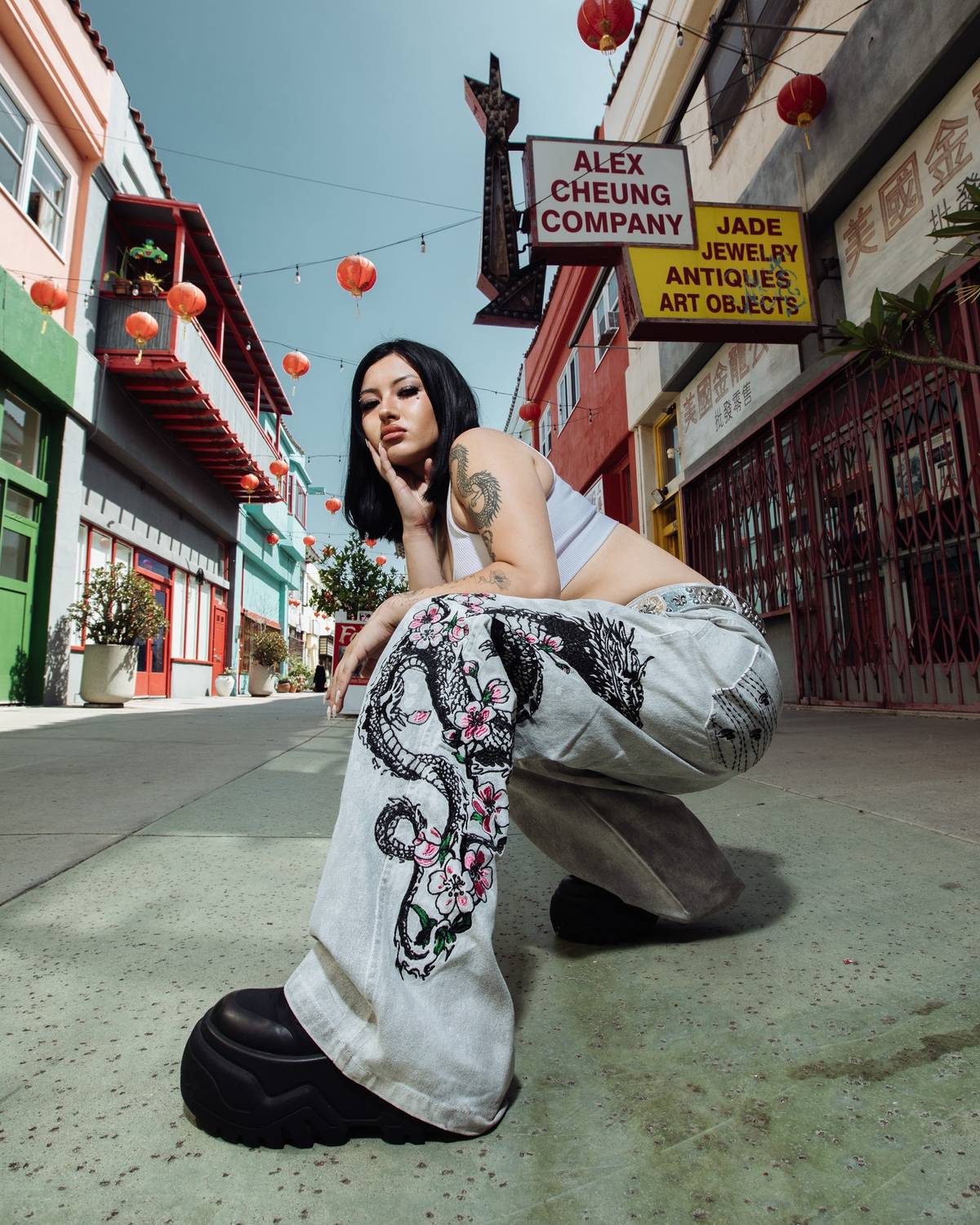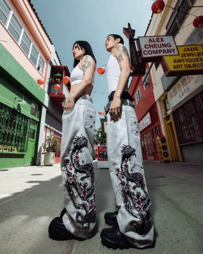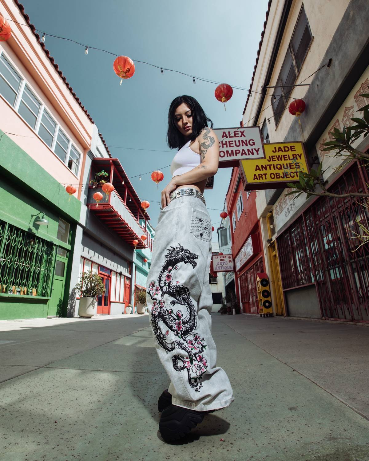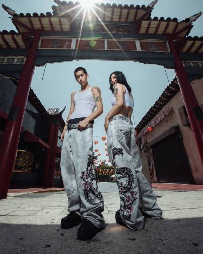 Unleash bold energy with our Dragon Embroidery Denim — where East Asian artistry meets modern streetwear. These light-wash baggy jeans feature an intricate black dragon winding down the leg, brought to life with pops of pink cherry blossoms and traditional script-style accents.