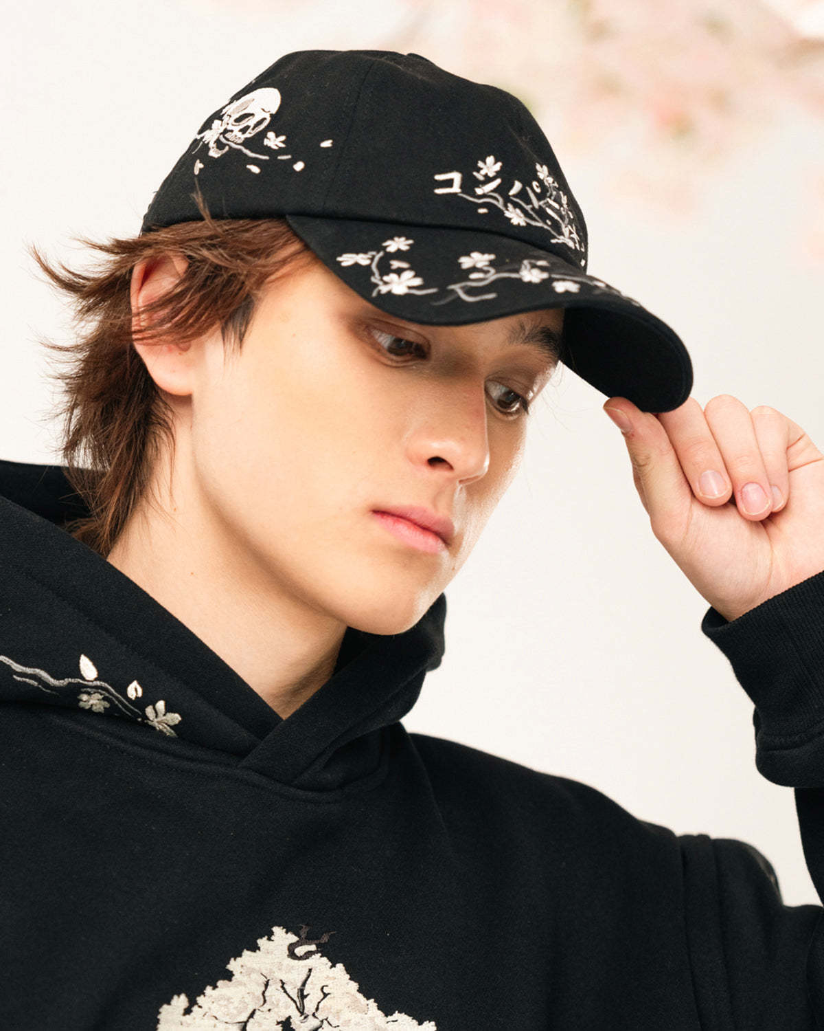 Custom 6 Panel Cap with All Over Skull Blossom Embroidery