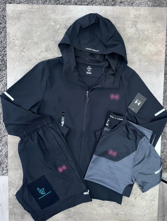 The UNDER ARMOUR UTILITY TRI SET in Black/Pink combines advanced UA Storm technology to repel water while maintaining breathability. Crafted from lightweight, stretch-woven fabric with 4-way stretch, it ensures superior comfort, durability, and unrestricted movement. The UA Tech™ t-shirt fabric is quick-drying, ultra-soft, and naturally comfortable, featuring sweat-wicking and odor control properties to keep you fresh. Reflective details enhance visibility, making this set ideal for active wear in varied conditions.